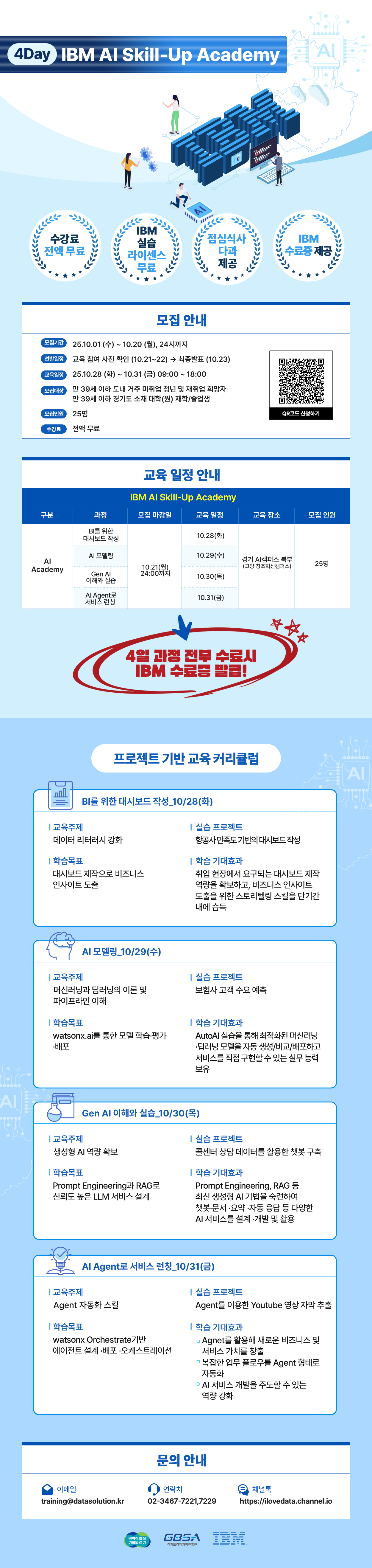 금번 무료교육은 경기도민 미취업자 또는 경기도소재 대학소속의 미취업자를 대상으로 BI 대시보드 작성 / AI 모델링 / GenAI 이해 및 실습 / AI Agent 서비스 런칭까지 이어지는 프로젝트 기반 실습형 교육으로 참가자들의 실무 역량을 강화할 수 있도록 기획되었습니다.