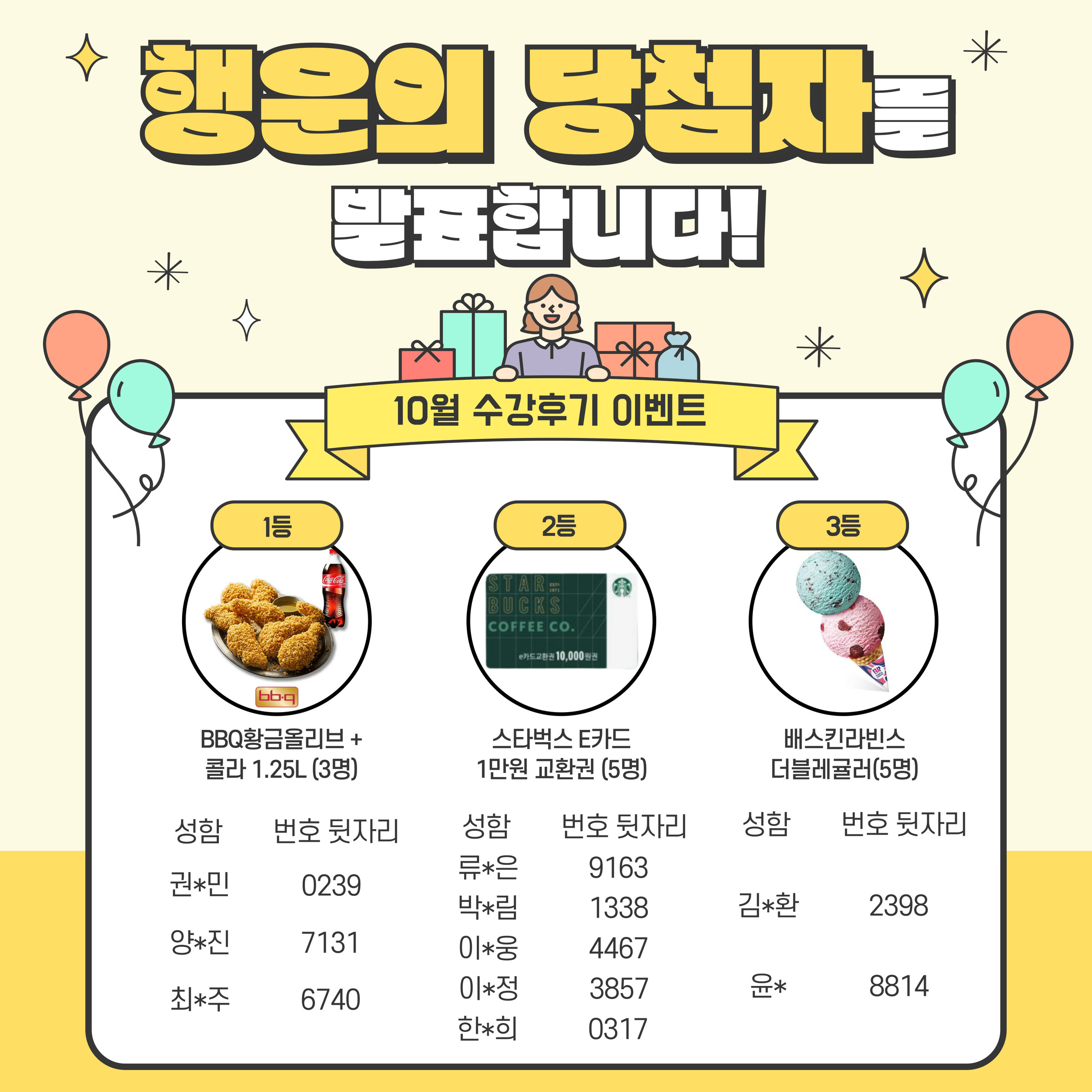 10월 진행된 교육에 대한 '수강 후기 작성 이벤트' 결과를 발표합니다.
